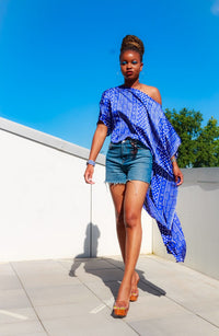 On adopte cette tunique asymétrique double longueurs dans une soie satinée imprimée bogolan pour une allure chic et élégante assurée.